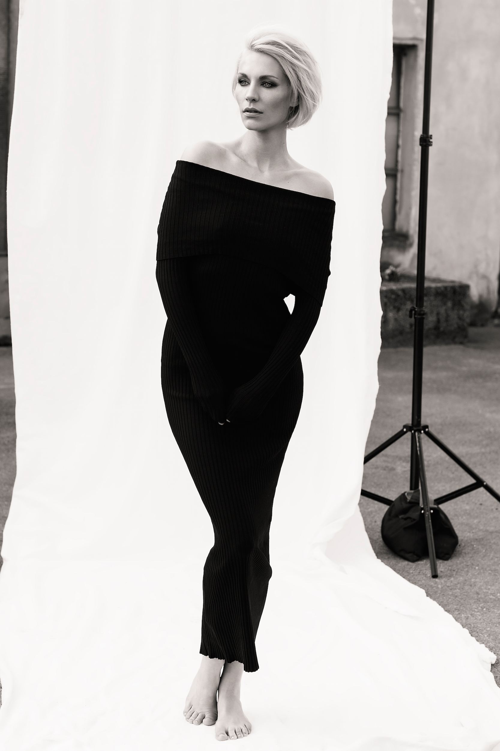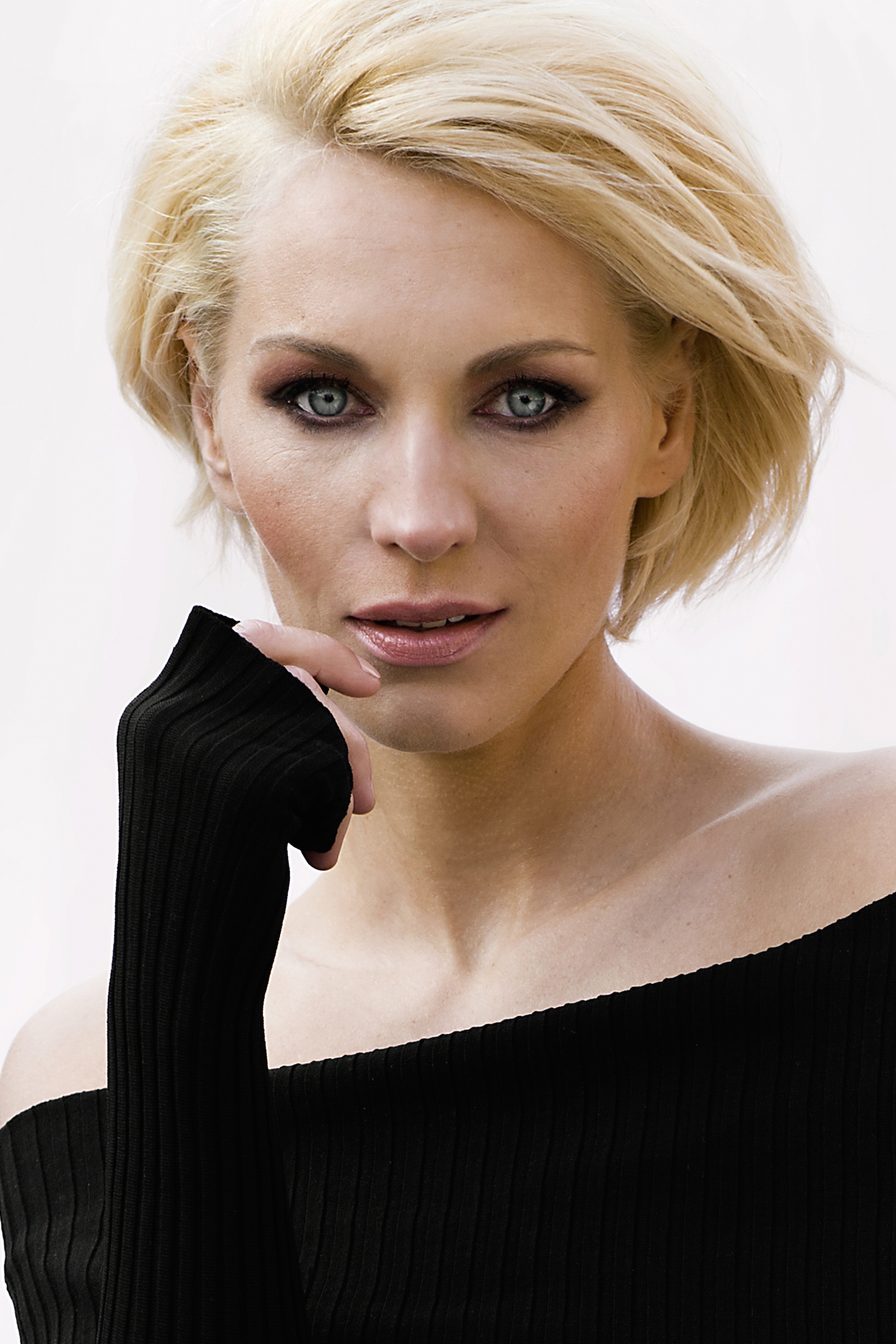 Das blonde Haar wurde lässig gestylt, was den Look cool-elegant erscheinen lässt und perfekt mit den dramatischen Smudged Eyes harmoniert.