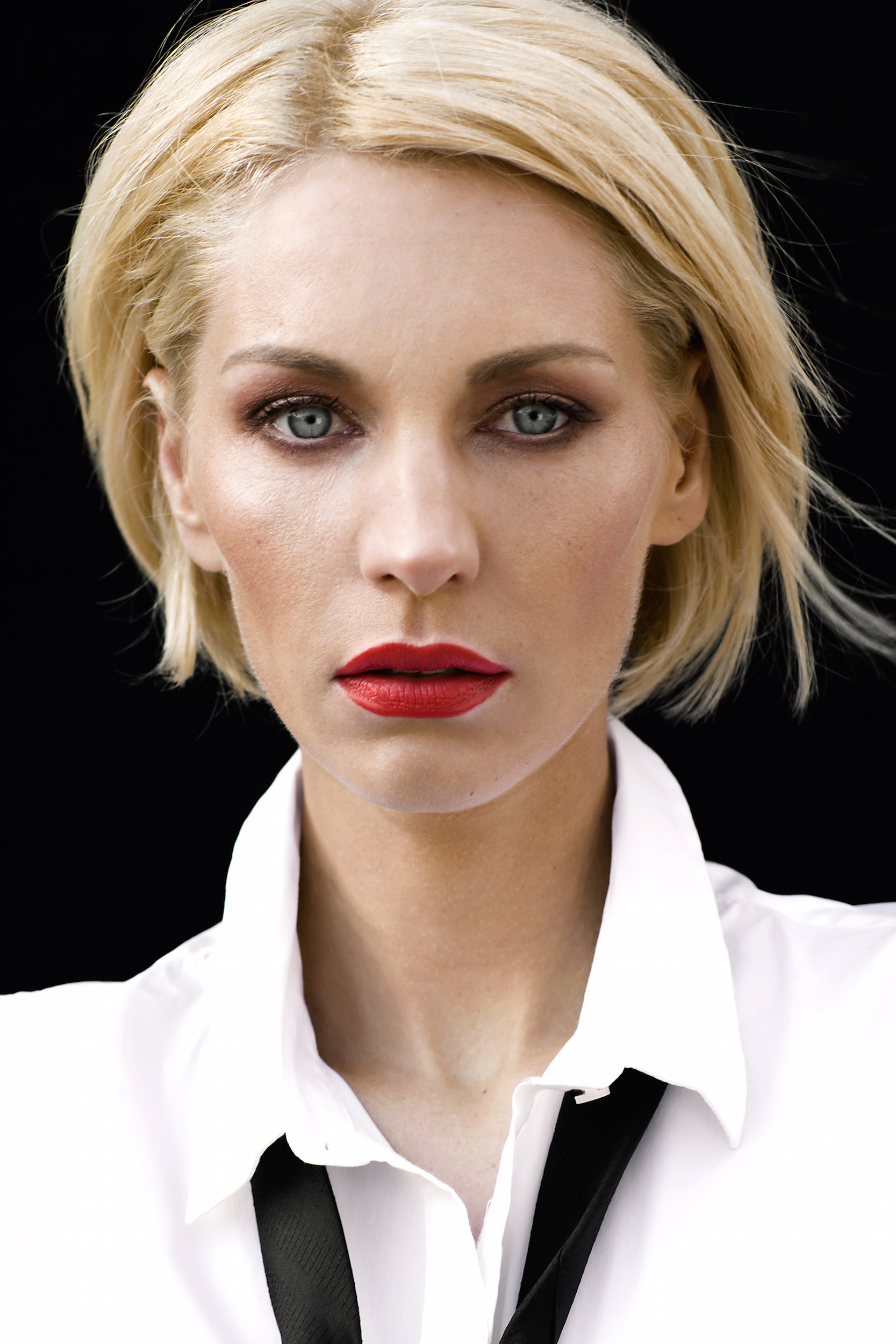 Die Smudged Eyes wurden mit dunklen, rauchigen Farbtönen geschminkt und mit einem mittleren, warmen Farbton oberhalb der Lidfalte verblendet, um einen Übergang zu schaffen und die blauen Augen zu betonen. Ein dunkler Lidschatten am unteren Wimpernkranz intensiviert den rauchigen Look. Die Lippen wurden in klassischem Rot oder Nude gehalten, was beides perfekt mit dem intensiven Augen-Make-up harmoniert.