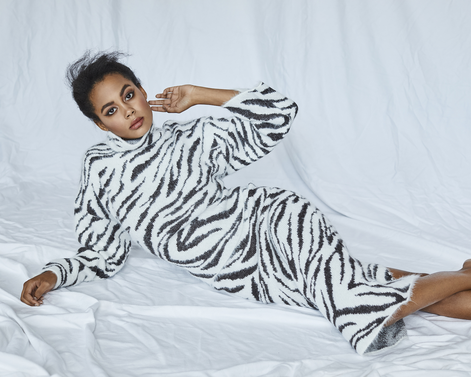 Dieser Look kombiniert natürliche Eleganz mit besonderen Details, ideal für ausdrucksstarke Werbekampagnen, Fashion-Editorials oder Events.