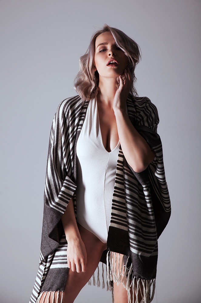 Das Make- up lebt vom Bronzer-Contouring und den zarten Farben. für das Body Make-up wurde MAC Face and Body mit Hautcreme gemischt, um einen zarten, natürlichen Glow zu erzielen.
