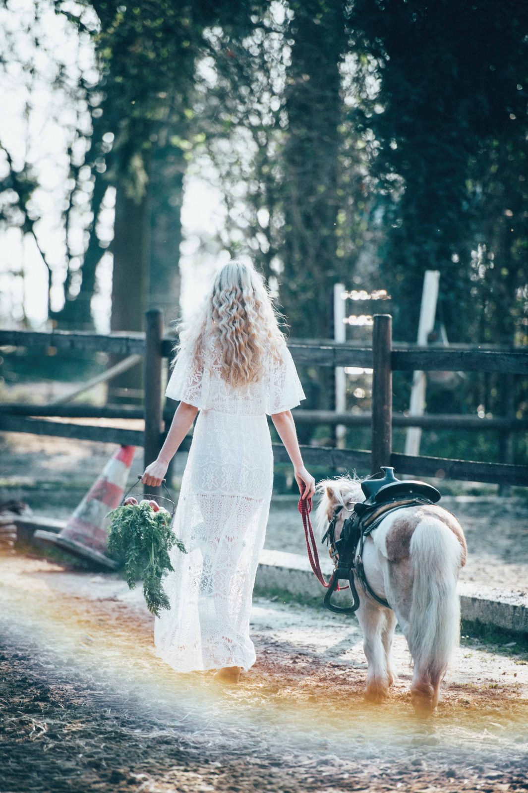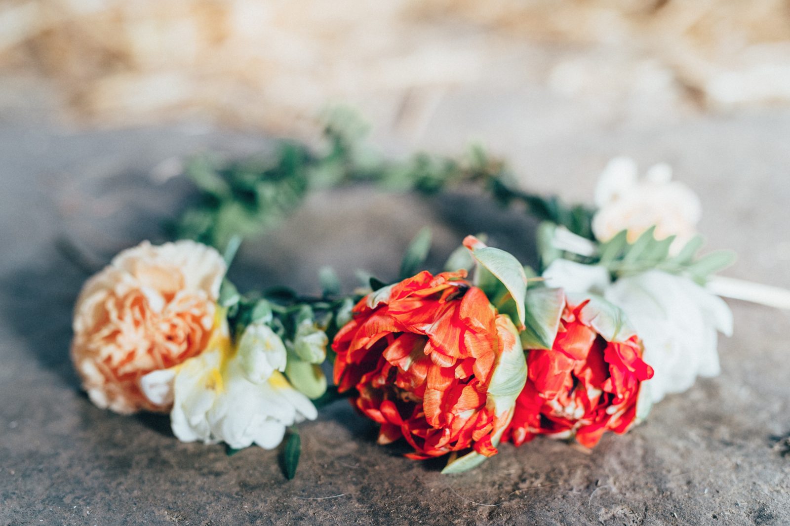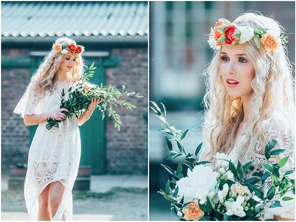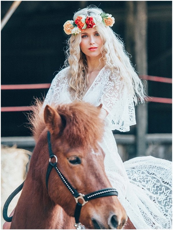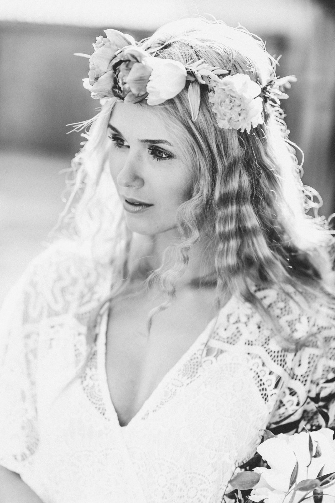 Die Haare wurden in fließenden Wellen (Mermaid Waves) gestylt, die für eine entspannten Look sorgten. Ein Blumenkranz mit frischen Blüten ergänzte die Frisur und verlieh ihr eine besondere Note.