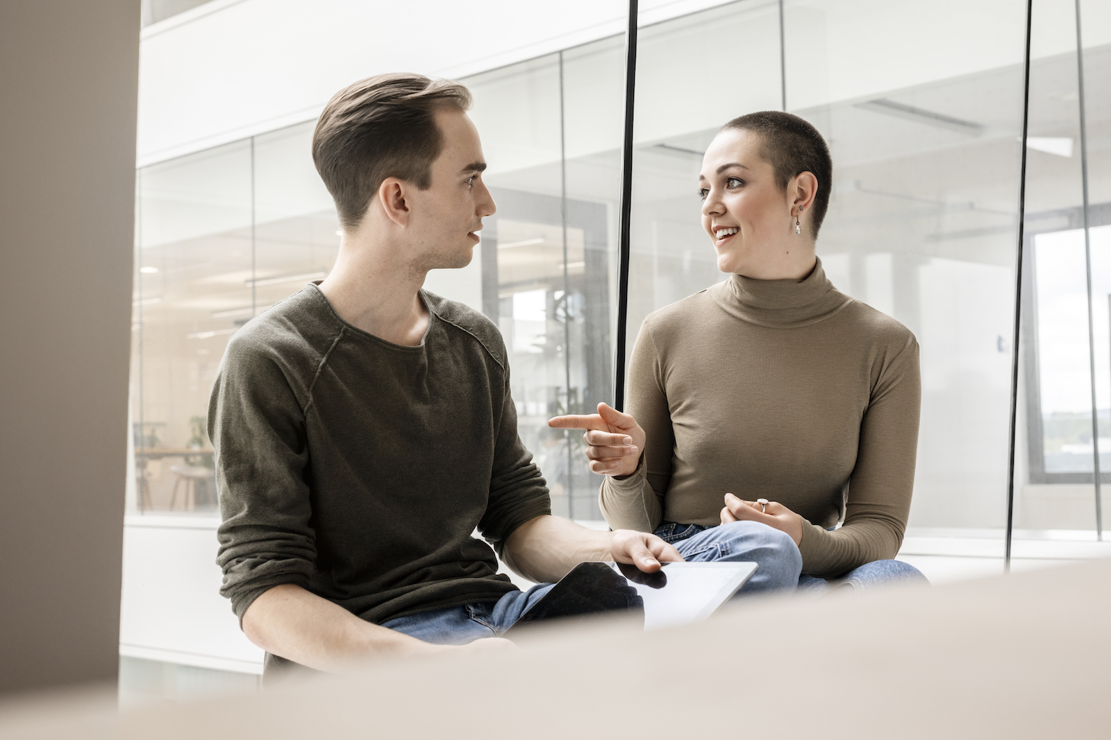 Die Haare wurden lässig und unkonventionell gestylt, um einen natürlichen Look zu kreieren, der den lebhaften Charakter der Arbeitssituation unterstreicht. Mit locker gestylten Haaren bleibt der Look professionell, ohne dass störende Haarsträhnen vom Geschehen ablenken.