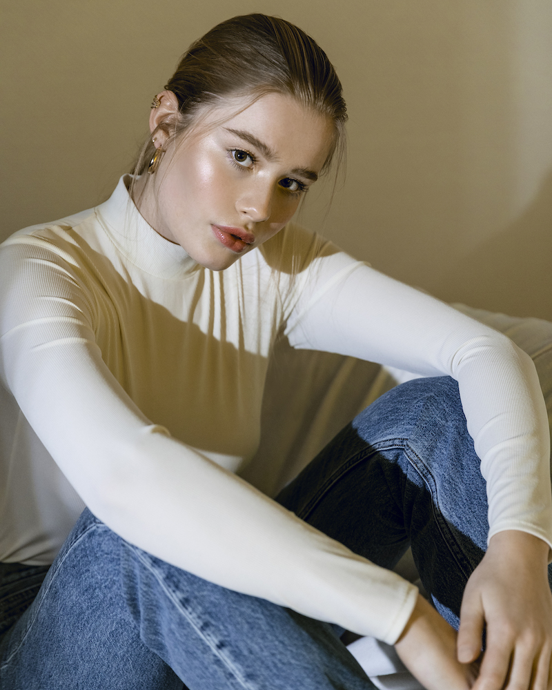 Dieses minimalistsiche Make-up besticht durch einen frischen, glowy Teint und reduziert gehaltene Augen, bei denen die Augenbrauen klar im Vordergrund stehen. Durch den gezielten Einsatz von Highlighter und die natürliche Betonung der Augenbrauen entsteht ein moderner, zurückhaltender Look, der besonders für Fashion-Shootings oder auch als every-day-make-up geeignet ist.