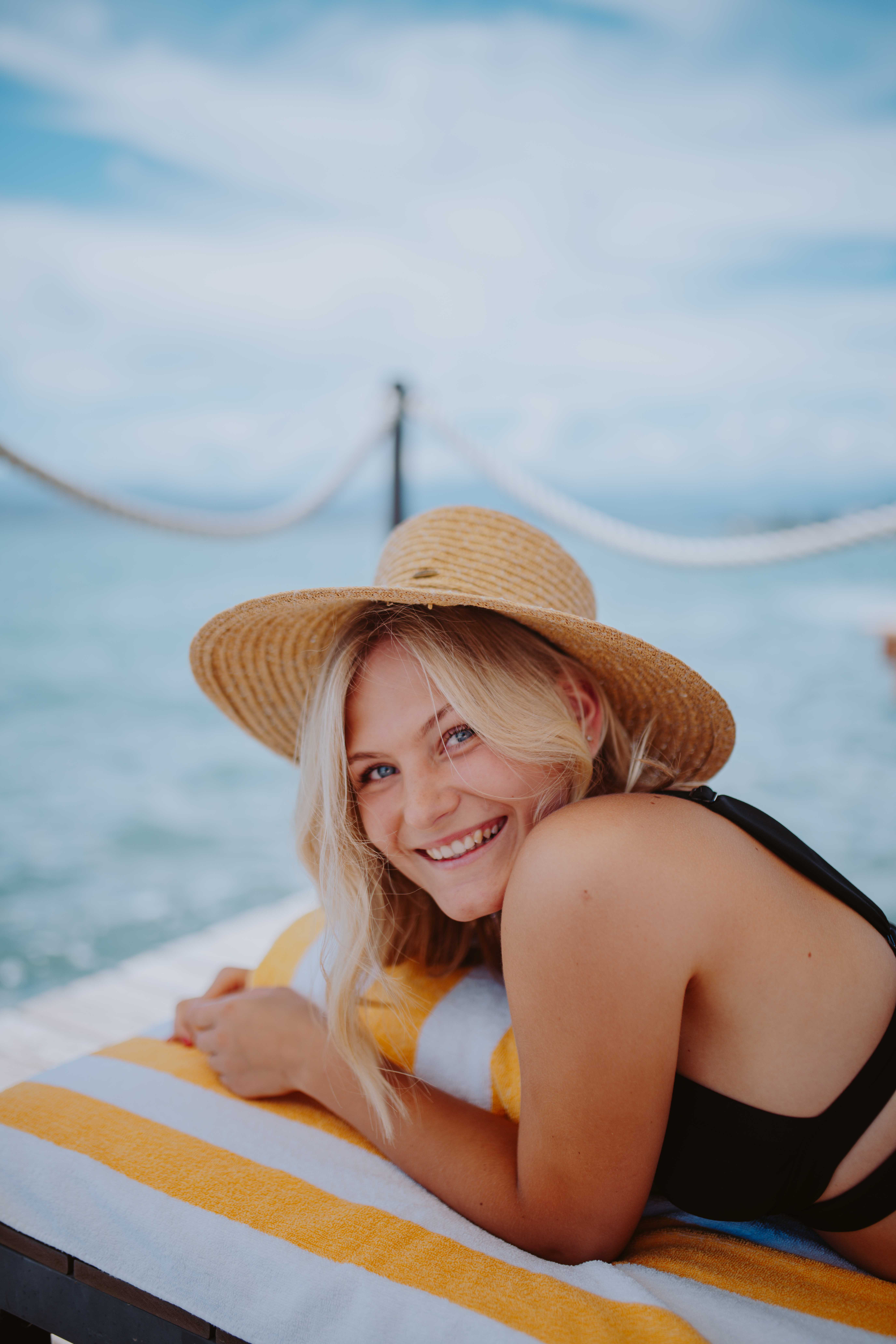 Die Natürlichkeit des Stylings unterstreicht unbeschwerte Pool-Atmosphäre und die entspannte Stimmung des Bildes.